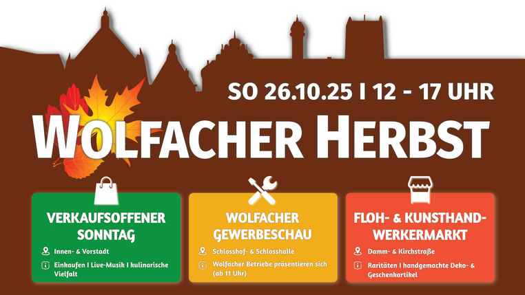 Bummeln, einkaufen und genießen beim Wolfacher Aktionstag und verkaufsoffenem Sonntag "Wolfacher Herbst" am 26.10.2025 von 12 - 17 Uhr.