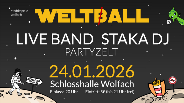 Taucht ein in eine galaktische Wolfacher Fasnetsparty unter dem Motto Welt(b)all – zwischen Erde, Sternen und Party-Planet!